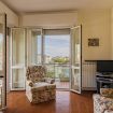 Un grande soggiorno con accesso a un ampio balcone, ideale per rilassarsi all’aperto.